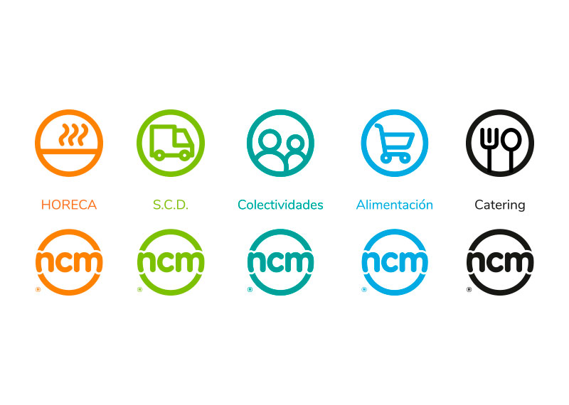 NCM es una marca viva, en movimiento y evolución constante, por ello, se generan multiplicidad de adaptaciones para mejorar su legibilidad y composición dependiendo del soporte donde vaya aplicada. La familia de tonalidades cromáticas se utiliza para identificar y diferenciar los servicios de la empresa. Además, se genera una línea de iconos que nos permita reforzar dicha actividad comercial a nivel visual.